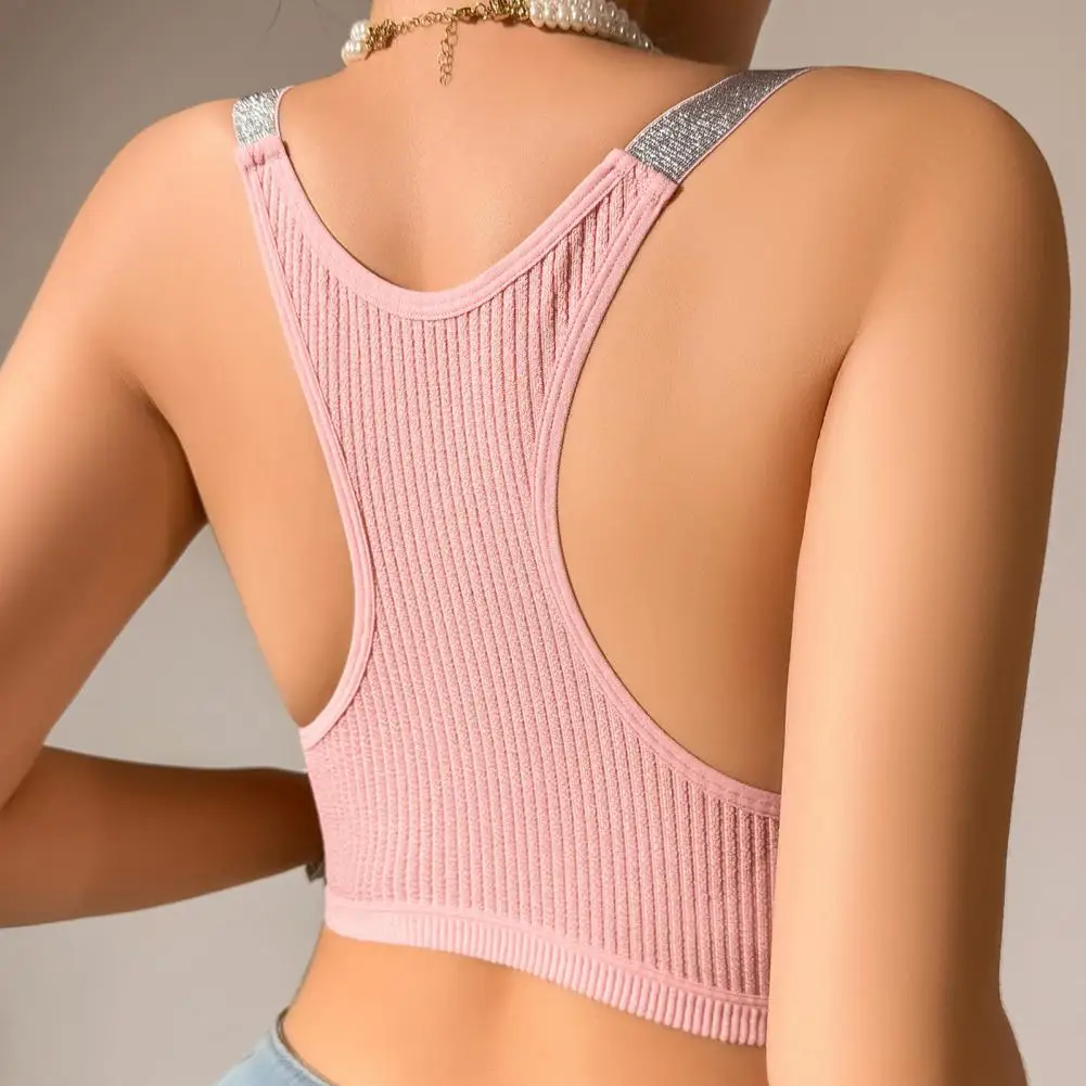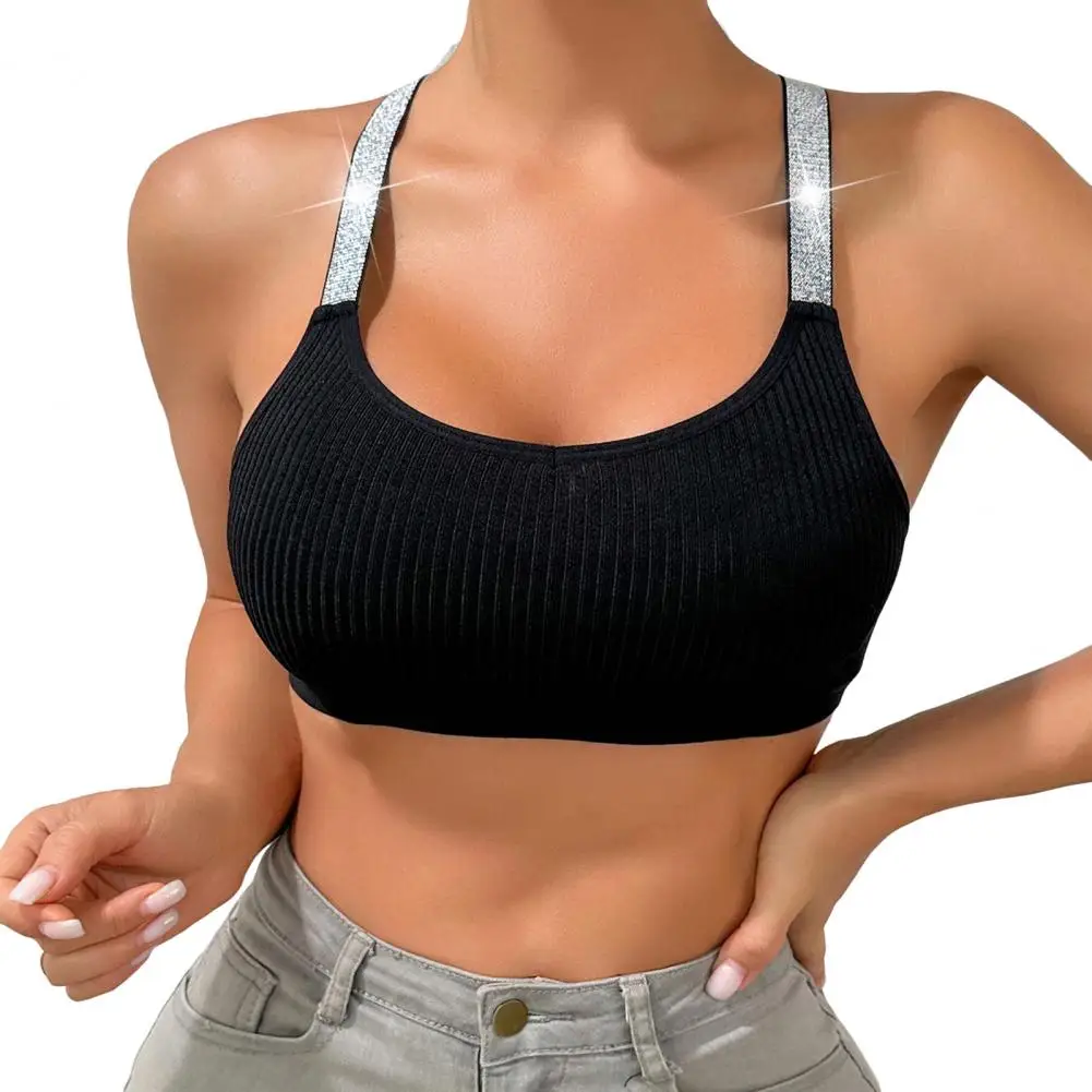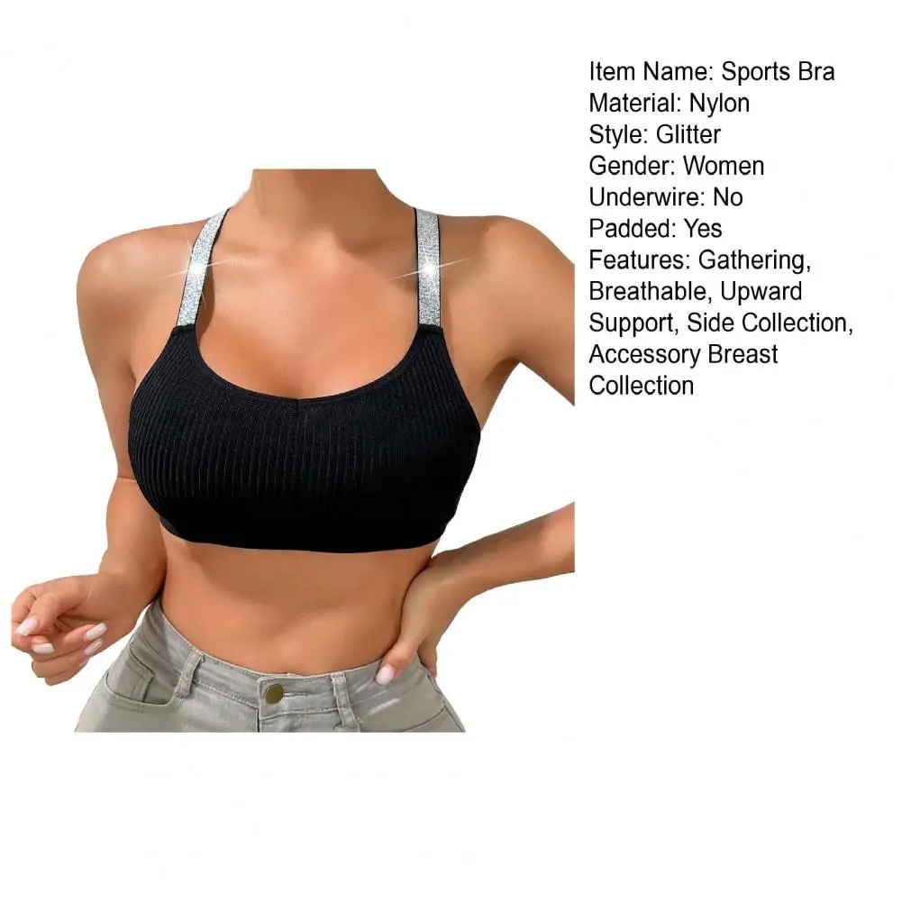 Lightweight Molded Cup Bra Contoured Cup Bra Glitter Sparkly Straps Ribbed Sports Bra for Women Racerback Crop Top for Active