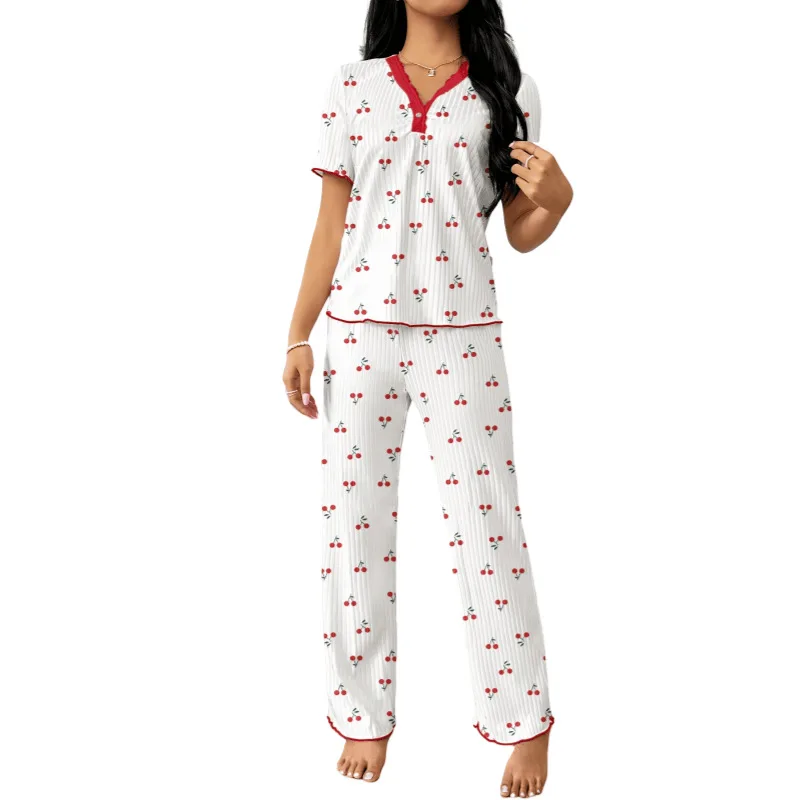 Pajamas Suit Women Sleepwear 2 Piece Sets Top Pants Short Sleeve Print V Neck Loungewear Summer Nightwear Trousers Outfits